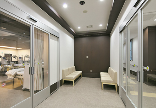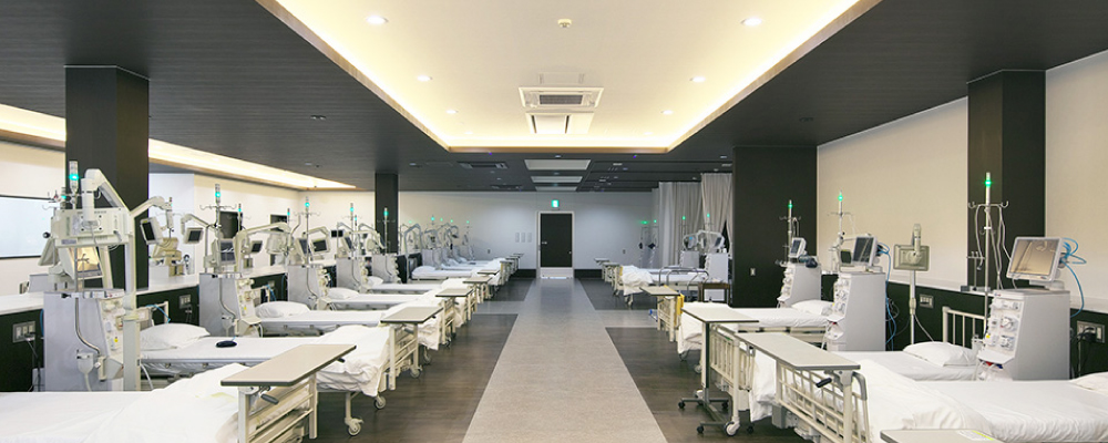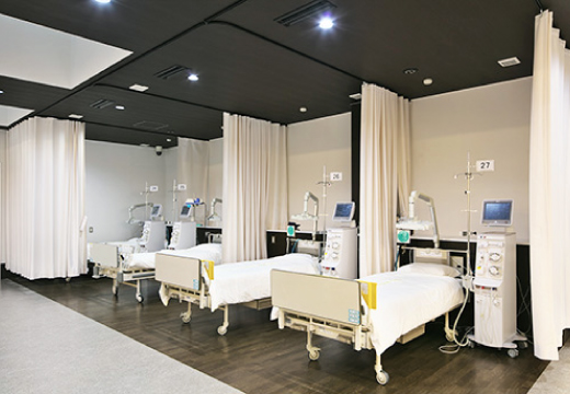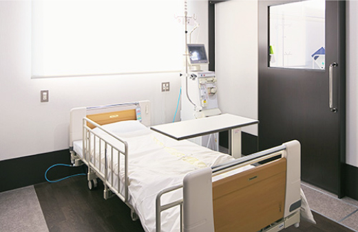 施設1階には透析センターを併設しておりますので、現在透析治療を受けている方にも対応可能です。最大30名が治療できる広々とした透析治療室は、光触媒装置・空気清浄活性機を随所に設置し感染症対策にも力を入れています。あたたかな照明を用い、落ち着いた雰囲気の空間でリラックスしながら治療を受けられます。(病状によってはお受けできない場合もございます。)